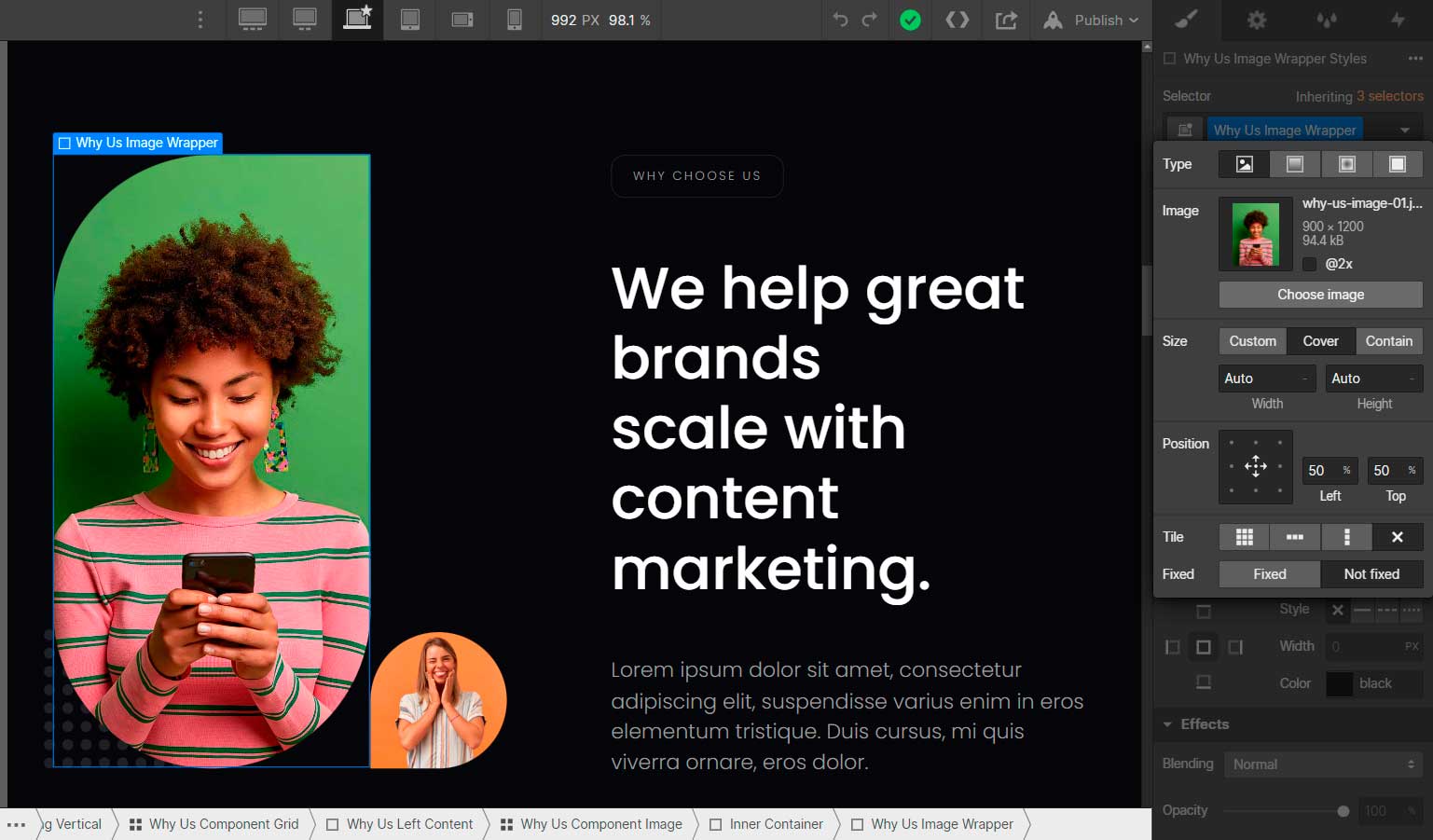 Images can be easily replaced in Webflow, just click on the image, when selecting it, go to the Background section in the right sidebar, click on Image > Choose Image.